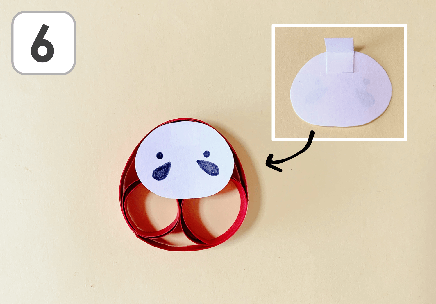 ⑥1で切った四角の白画用紙を使って、だるまの顔を輪に貼り付けます。