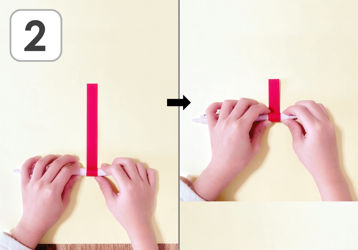 ②細長く切った赤の画用紙を、ペンを使って端から巻きます。