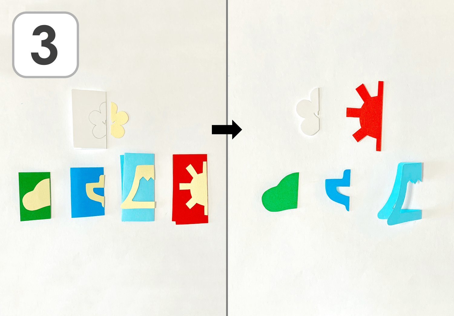 ③切り紙用の色画用紙を半分に折り、輪になった部分を右にして置きます。