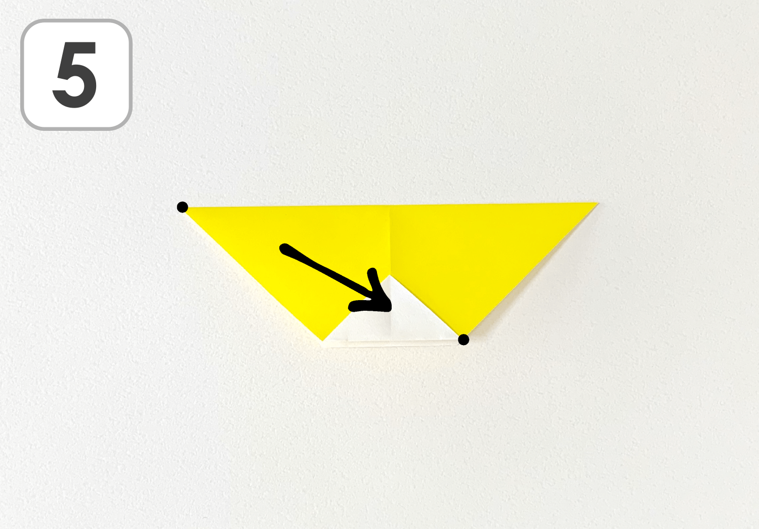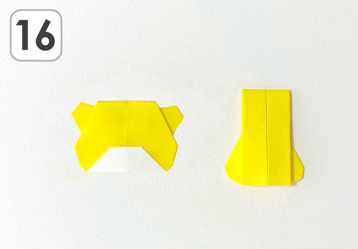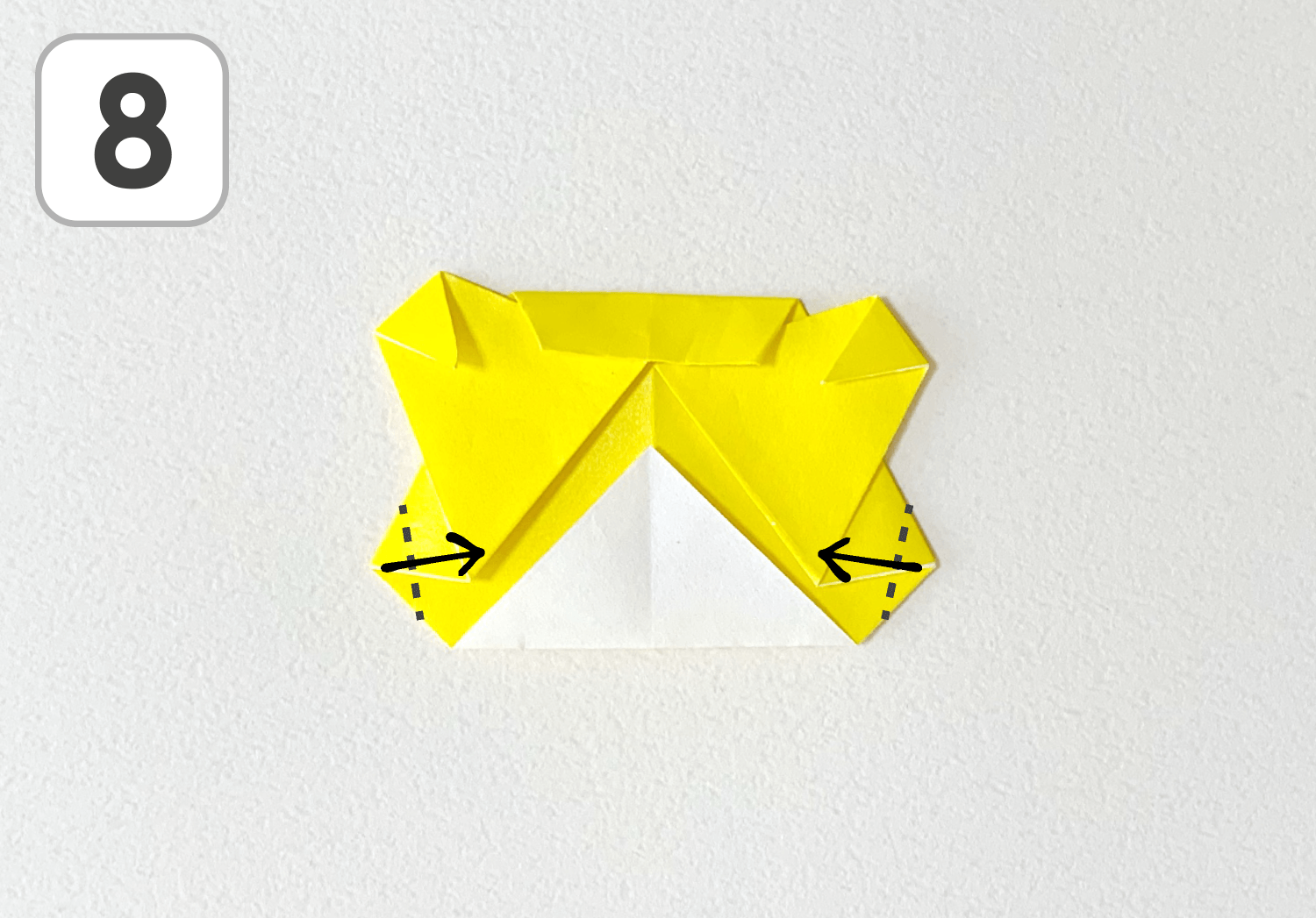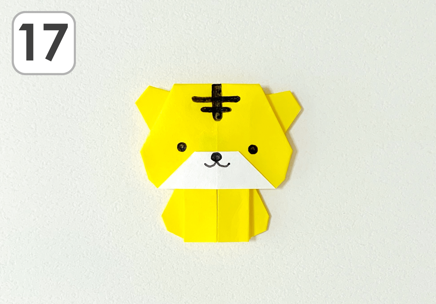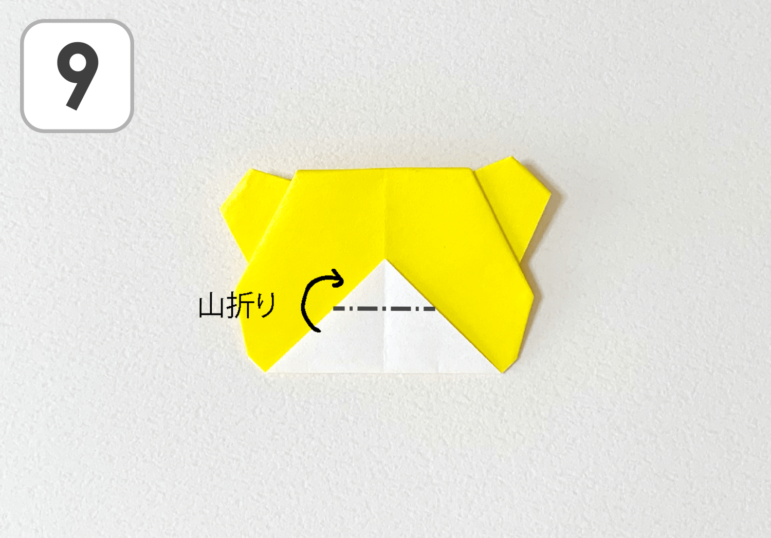 ⑨裏返して、白い部分の角を山折すると、とらの【顔】の部分が完成です。
