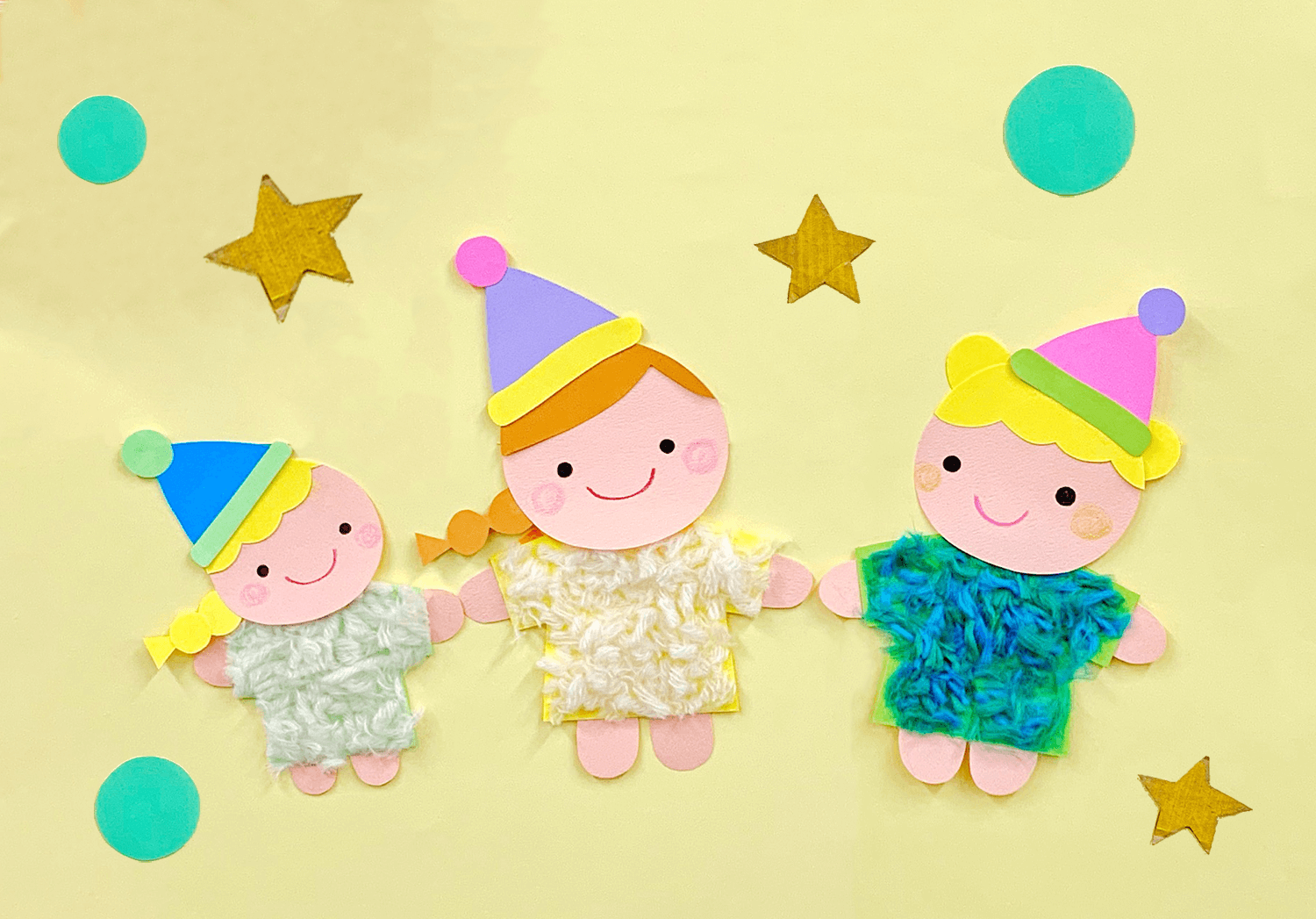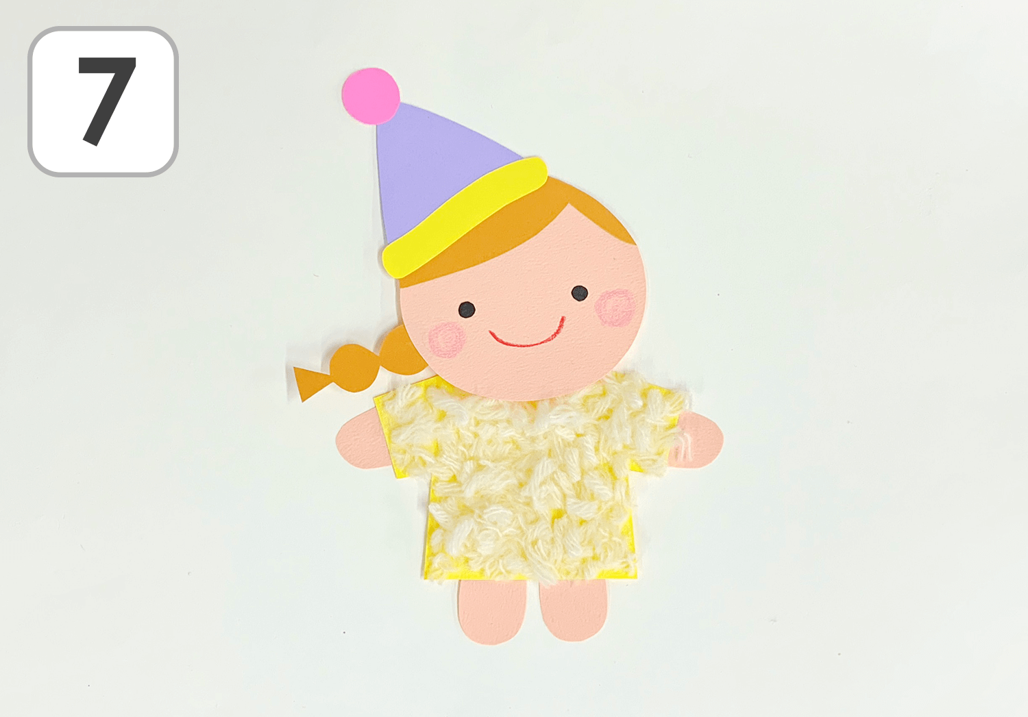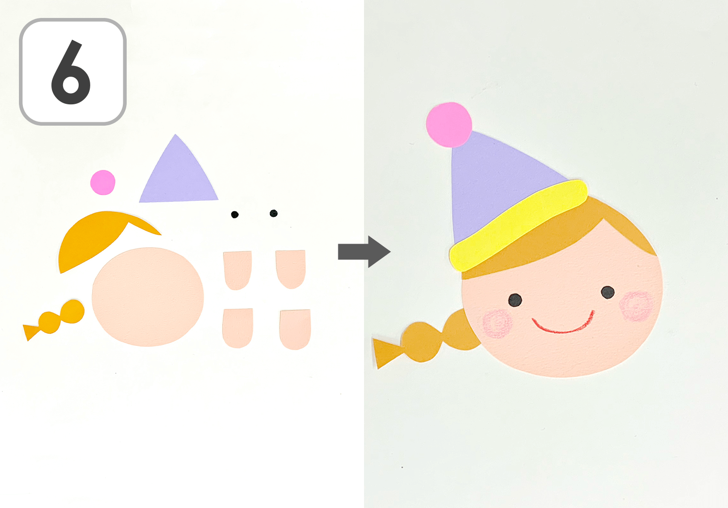 ⑥色画用紙で、顔と手足、帽子のパーツを切り出し、組み合わせて貼り付けます。