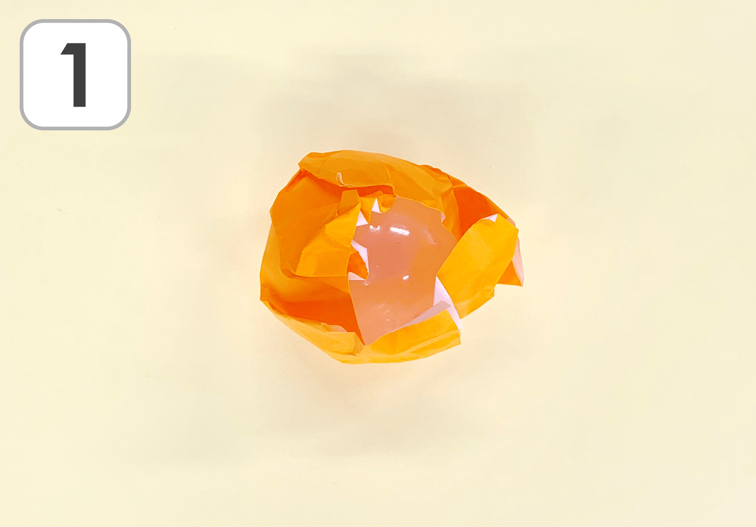 ①オレンジのおりがみでガチャガチャカプセルを包みます。