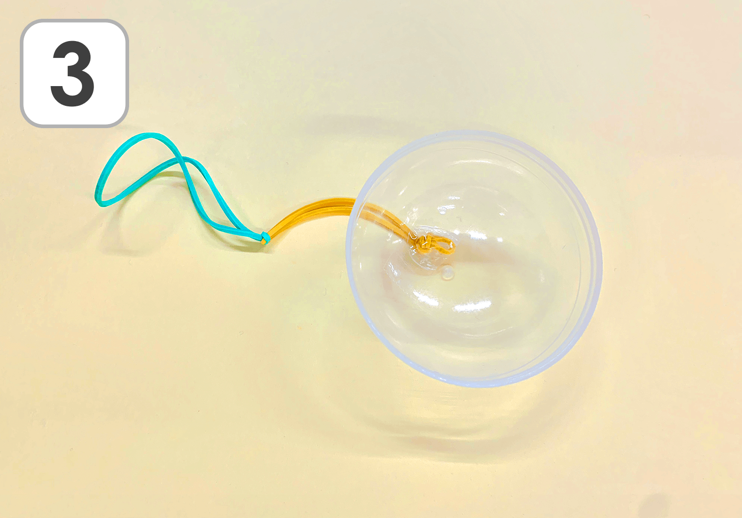 ③ガチャガチャカプセルの上部分に輪ゴムを通します。