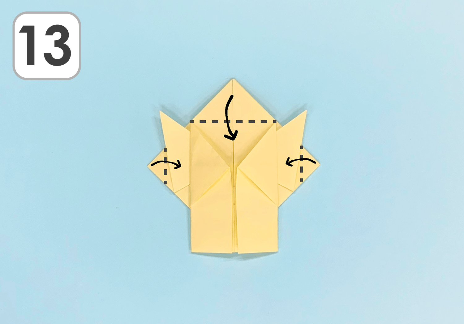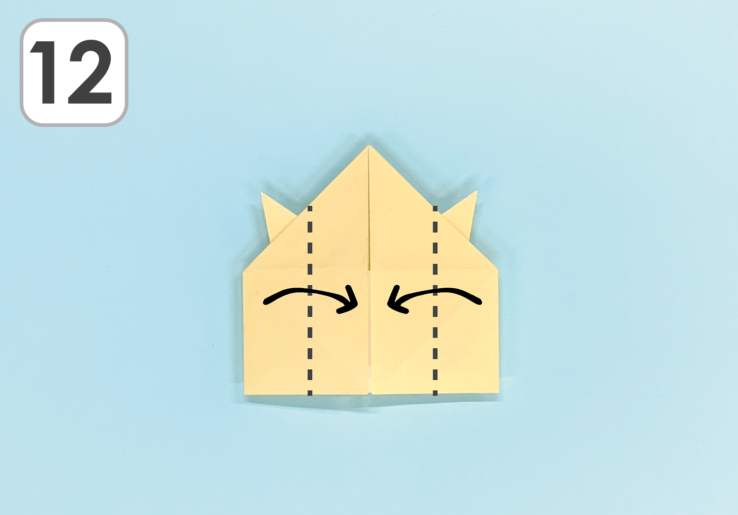 ⑫左右の辺を、中央の折り目に向かって折ります。
