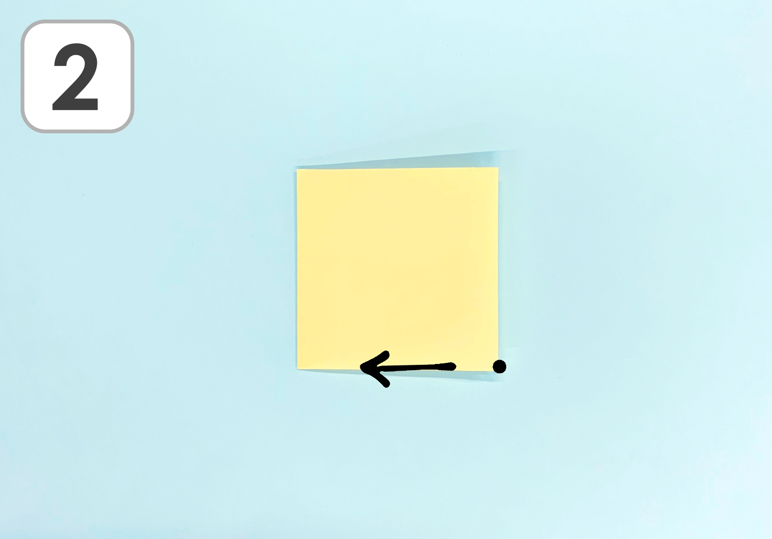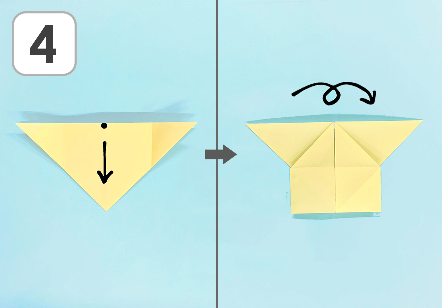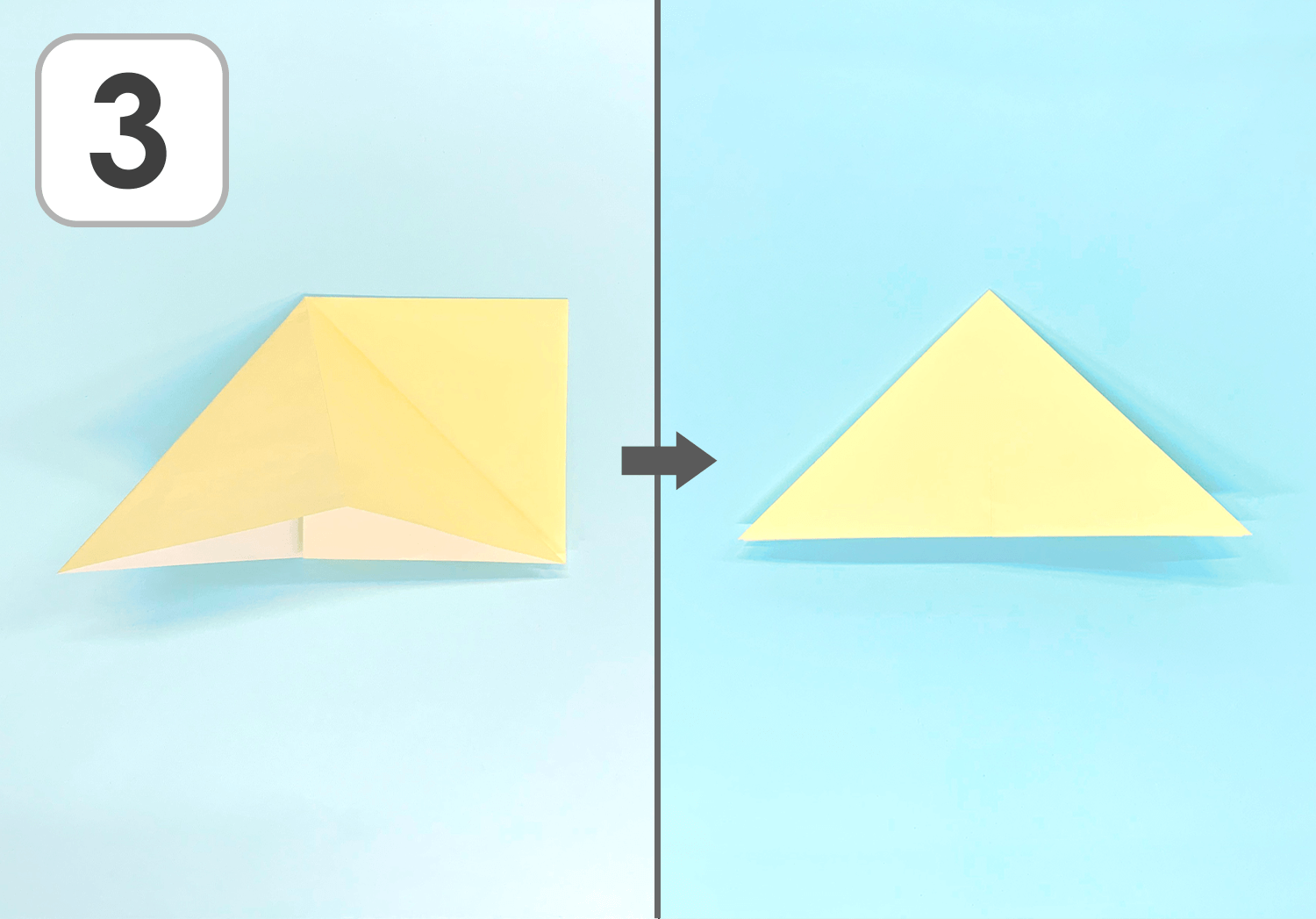 ●の部分の表の1枚をめくって下向きに広げ、潰すように折ります。