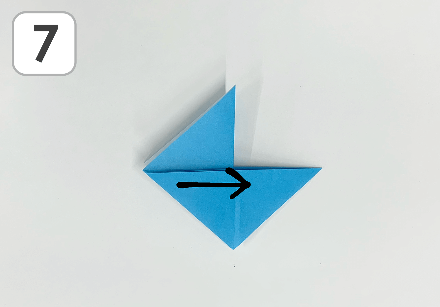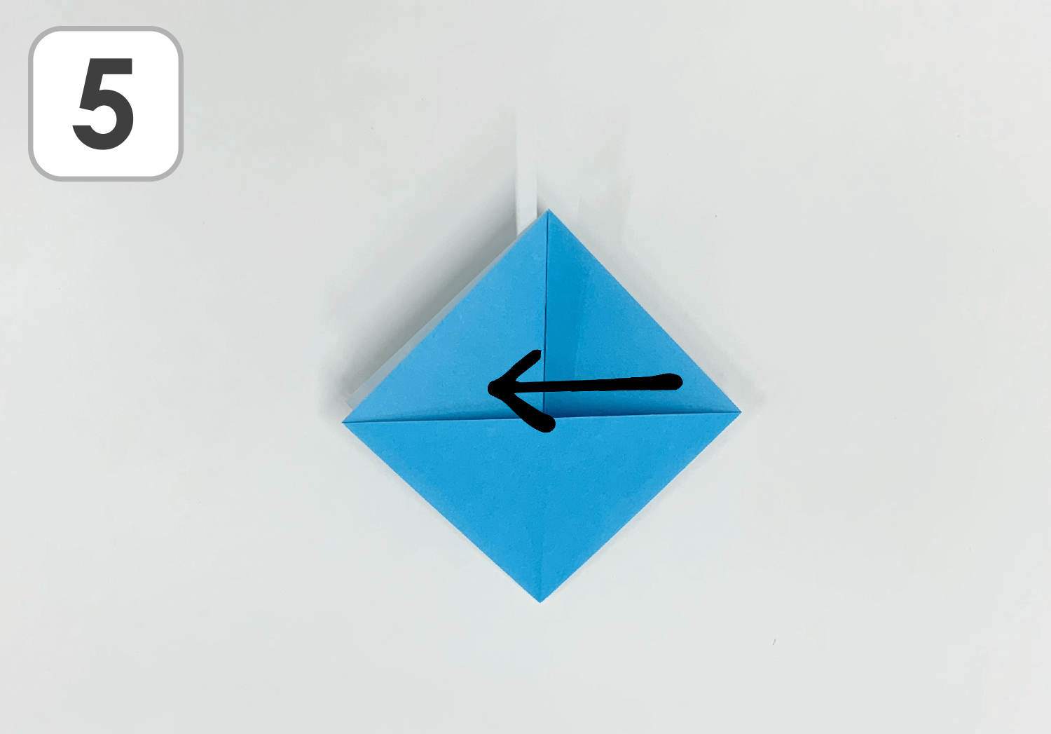 ③次に、色のついた面を内側にして、三角に2回折ります。