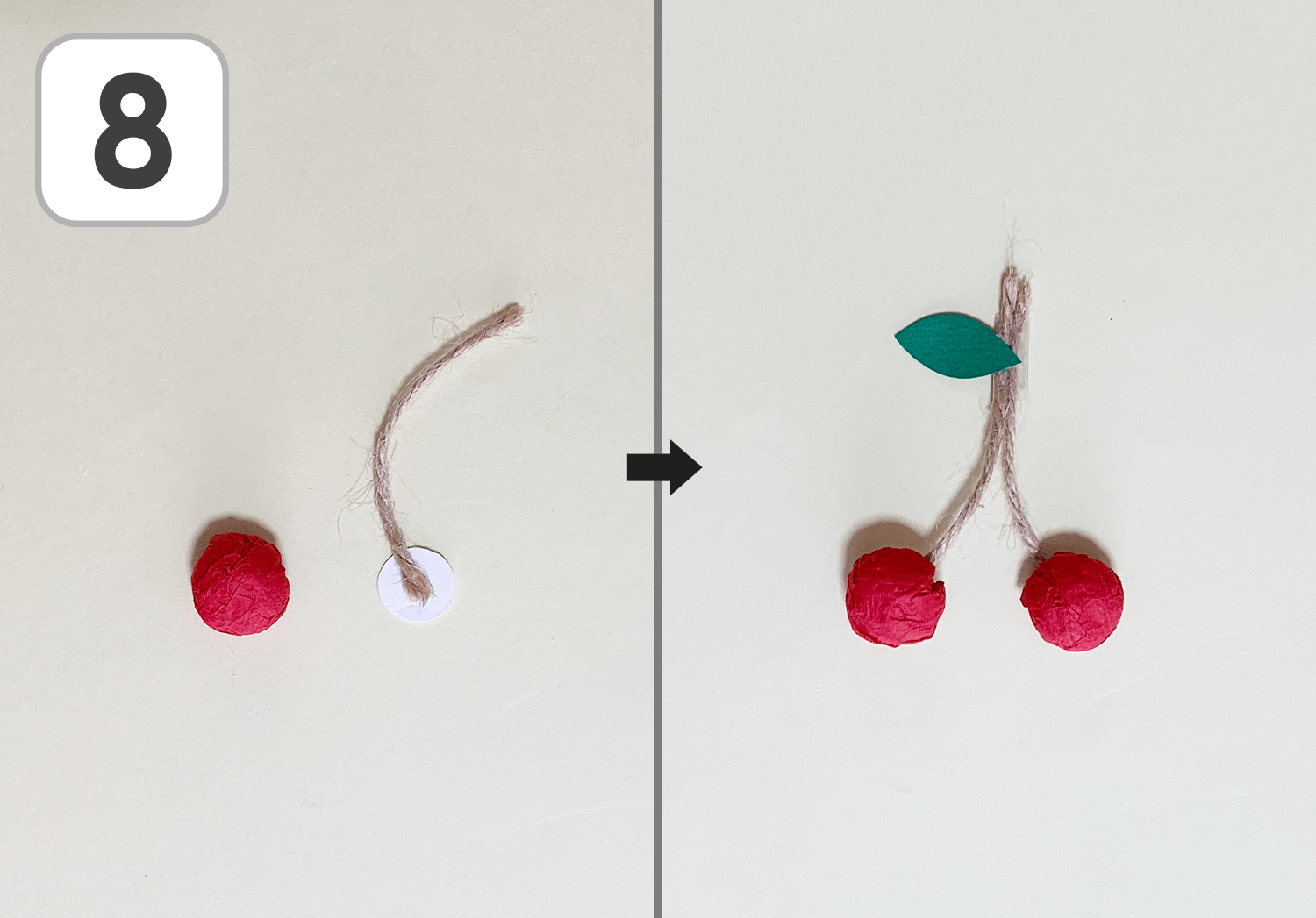 ⑧麻紐の端を、丸く切った白の画用紙にのりで接着します。
