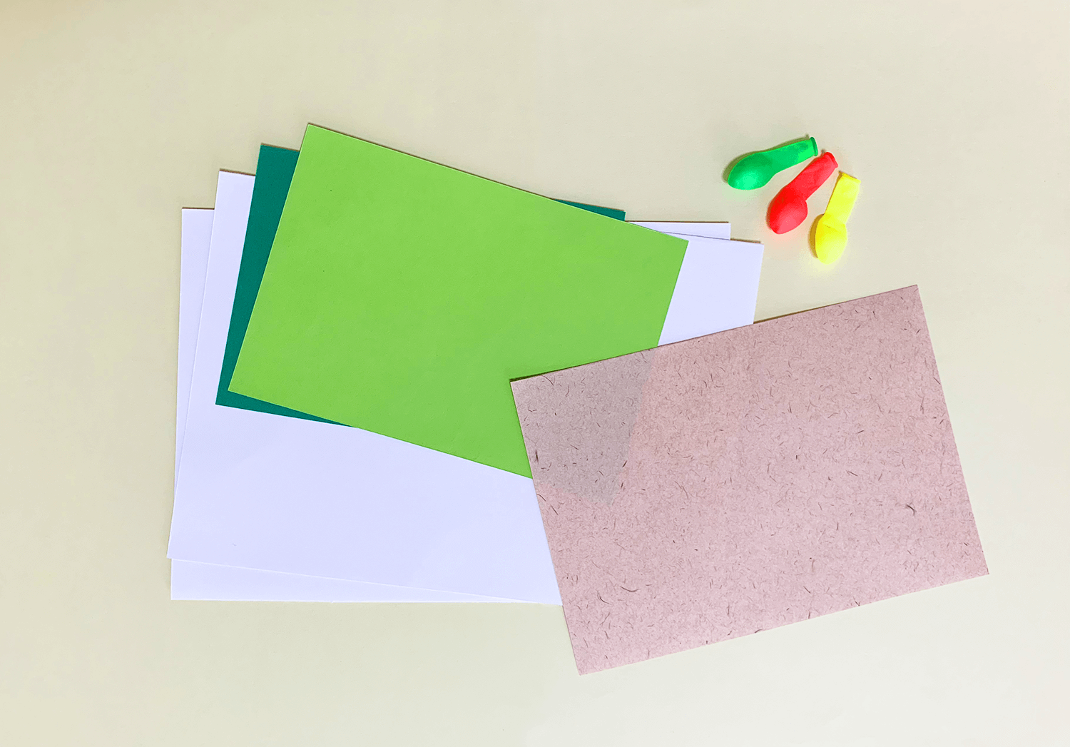 ⑥緑の色画用紙でトマトの葉、黄緑の色画用紙でトウモロコシの葉を切り出します。