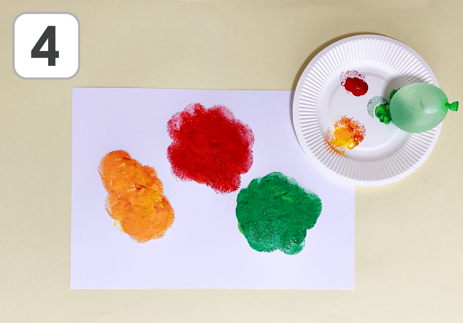 ③水風船を持ち、下の部分に絵の具を付け、1で用意した紙にスタンプします。