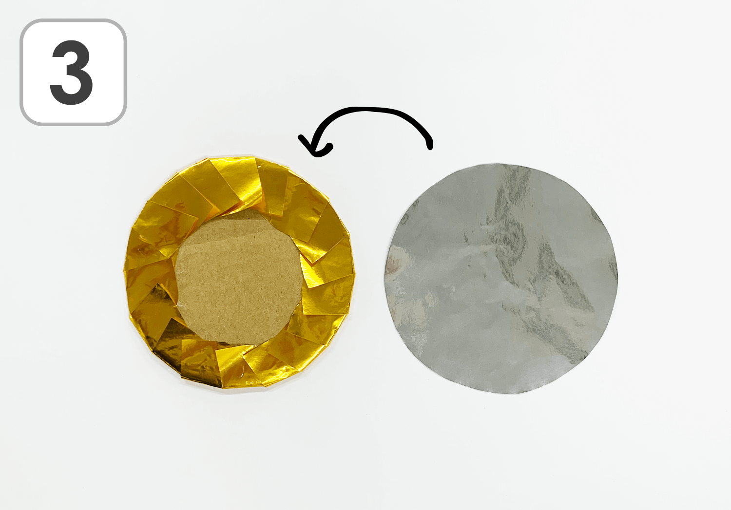 ②金色のおりがみの白い面に、【背面】のダンボール乗せます。