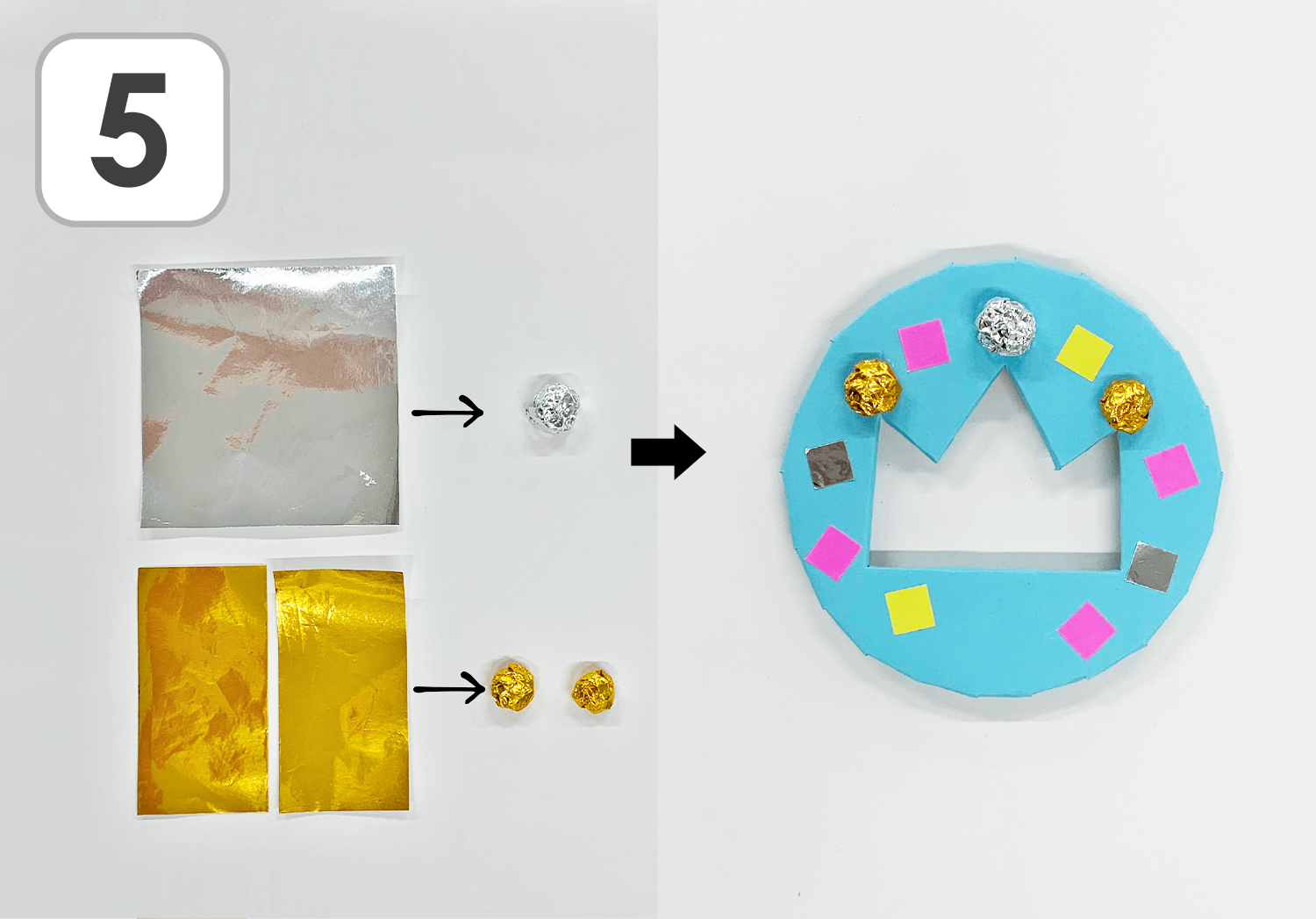 ⑤銀色のおりがみを1/4(7.5㎝×7.5㎝)に、金色のおりがみはさらに半分に切り、それぞれ丸めます。