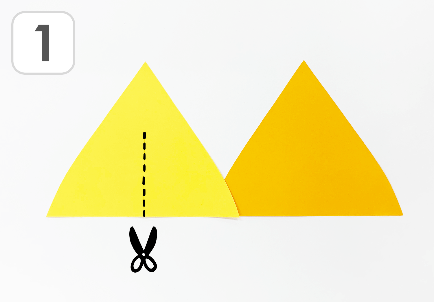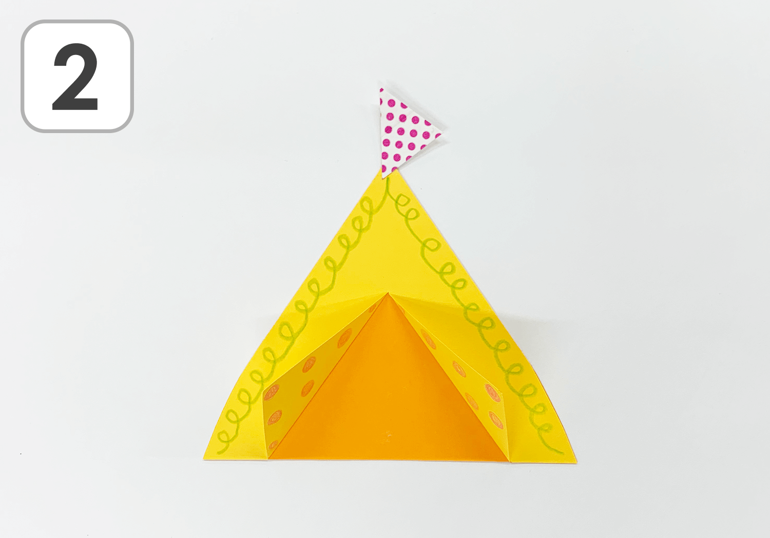 ①黄色とオレンジの色画用紙をテントの形に切ります。