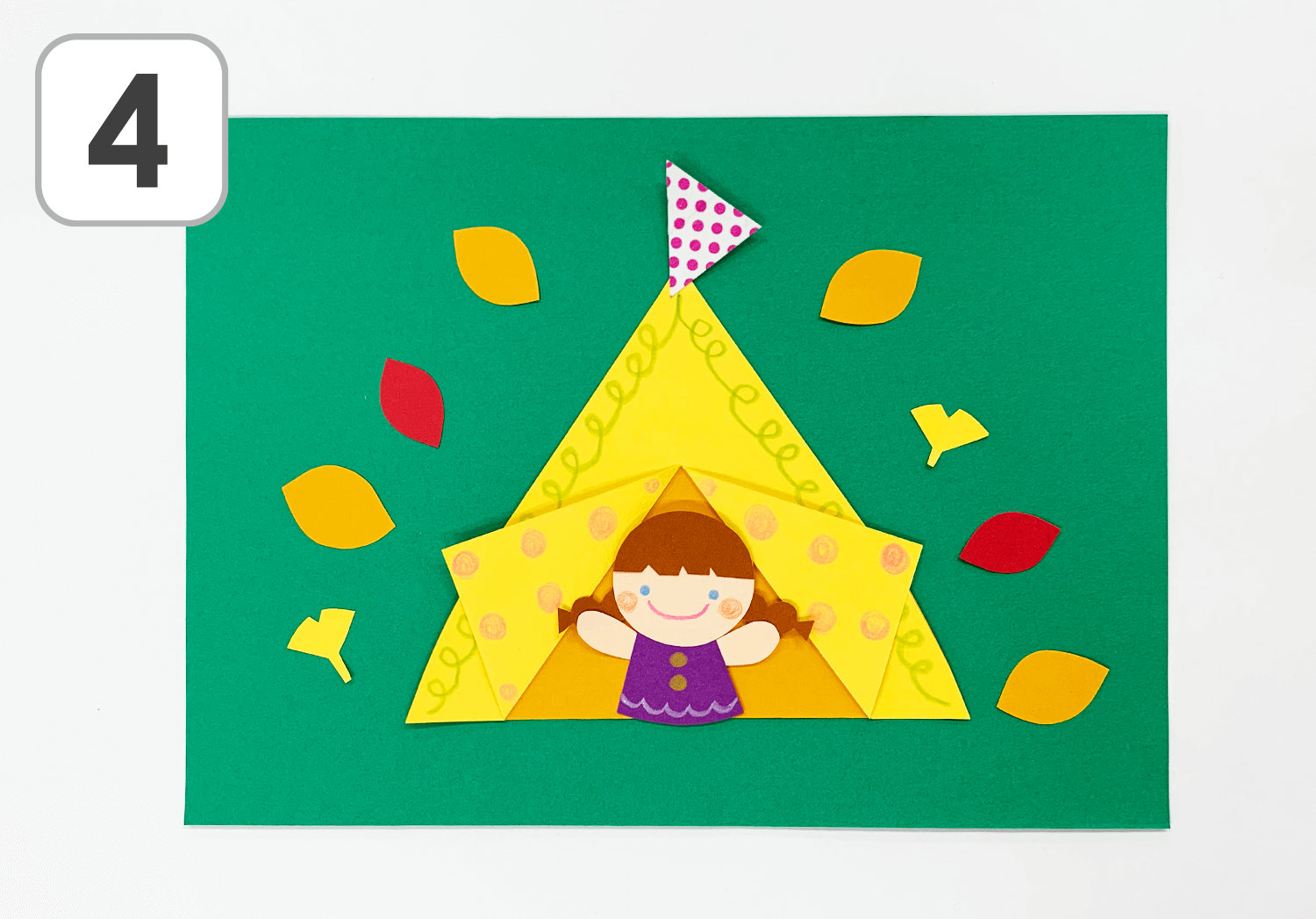 ④2のテントと3のパーツを組み合わせて、台紙用の緑の色画用紙に貼り付けると・・・