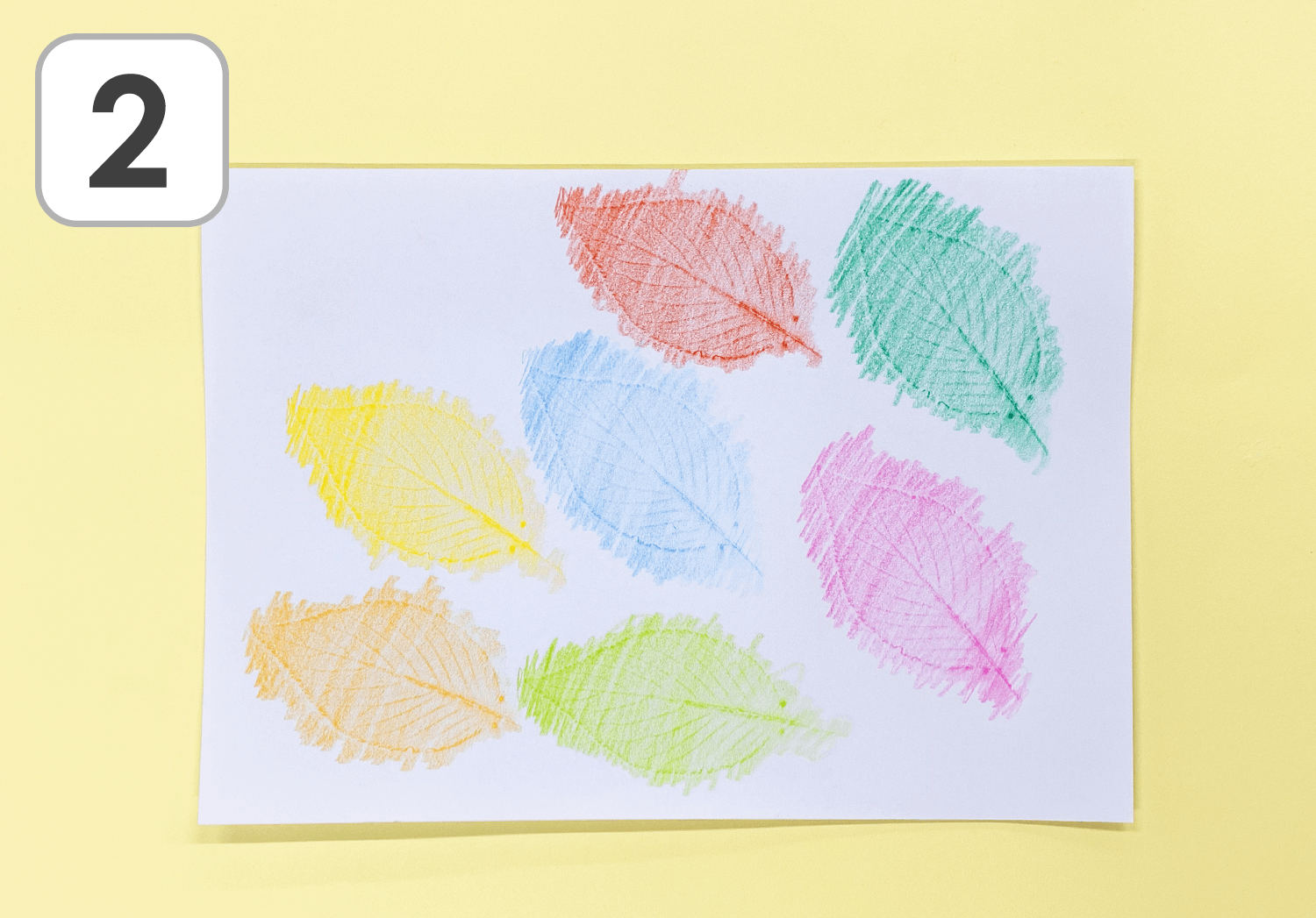 ①落ち葉を置き、コピー用紙をかぶせ、紙の表面を色鉛筆で擦ります。