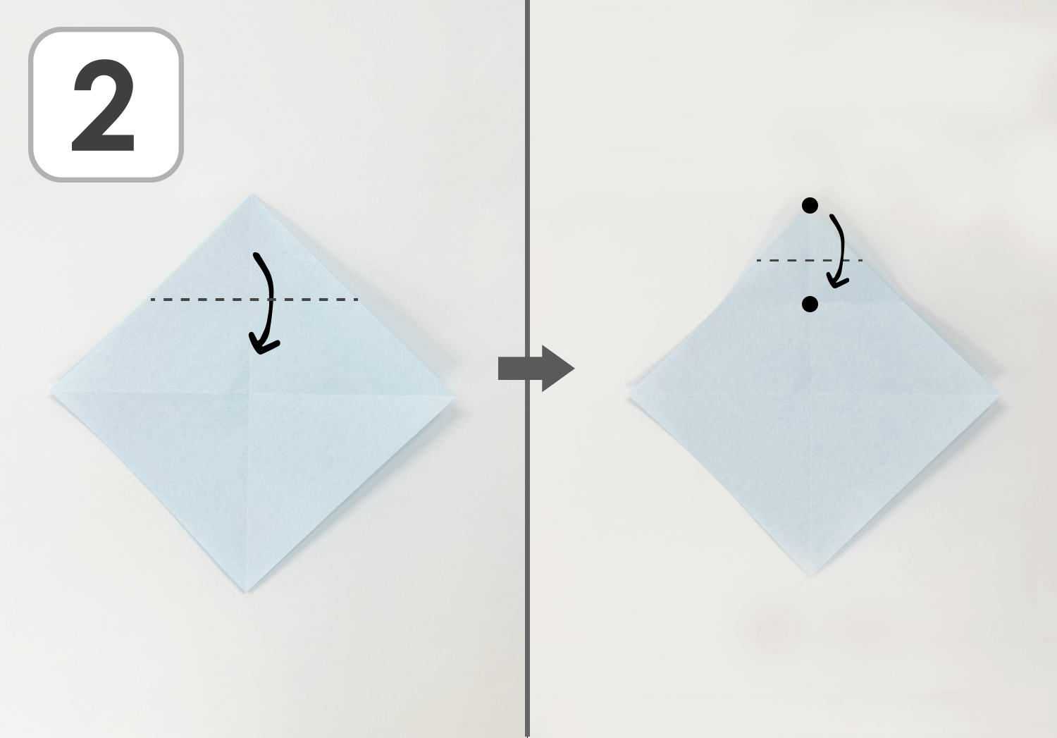 ②左:上の角を中心に合わせて折り、折り目を付けたら開きます。