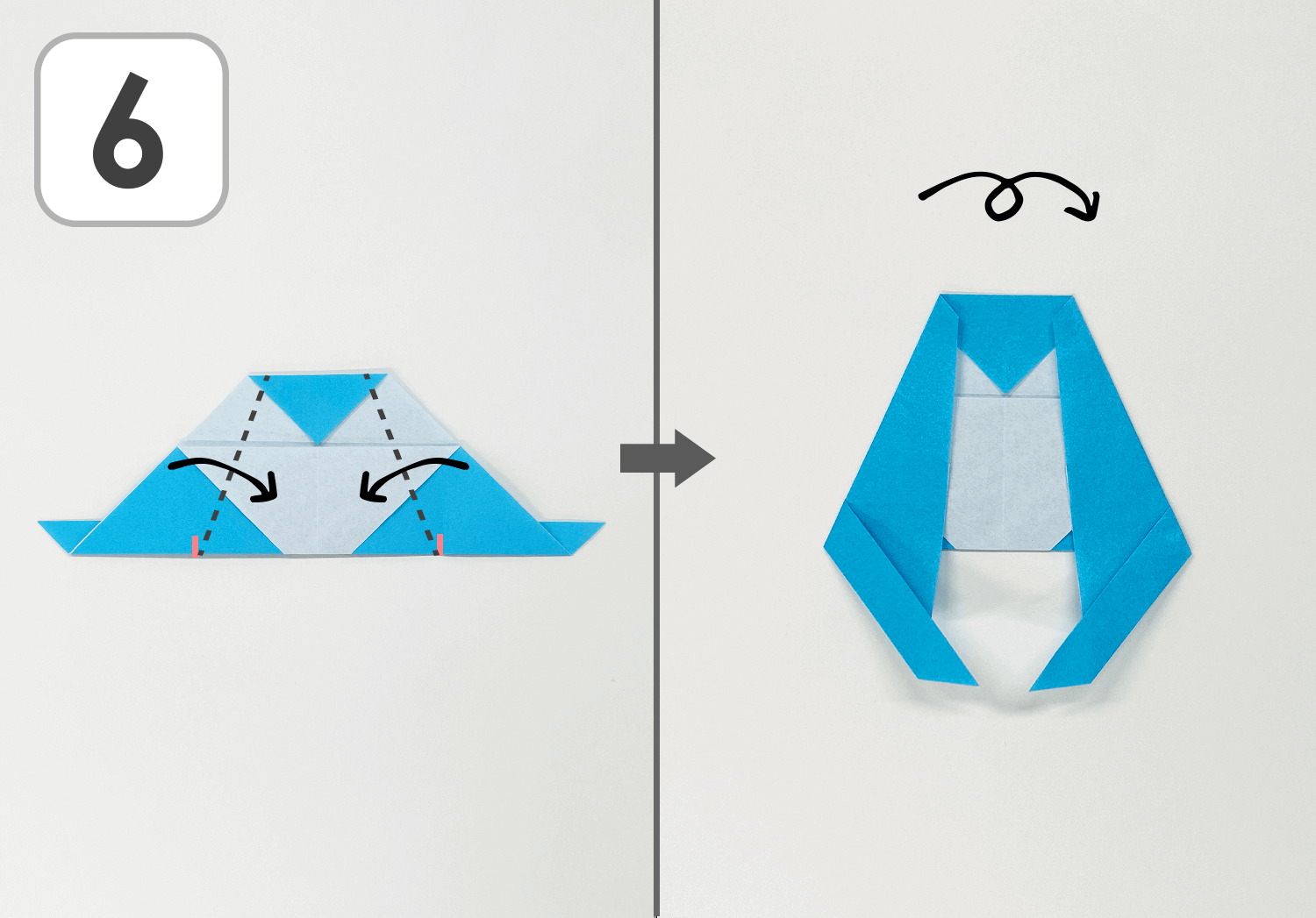 右:くちばし部分の角を上向きに折ります。