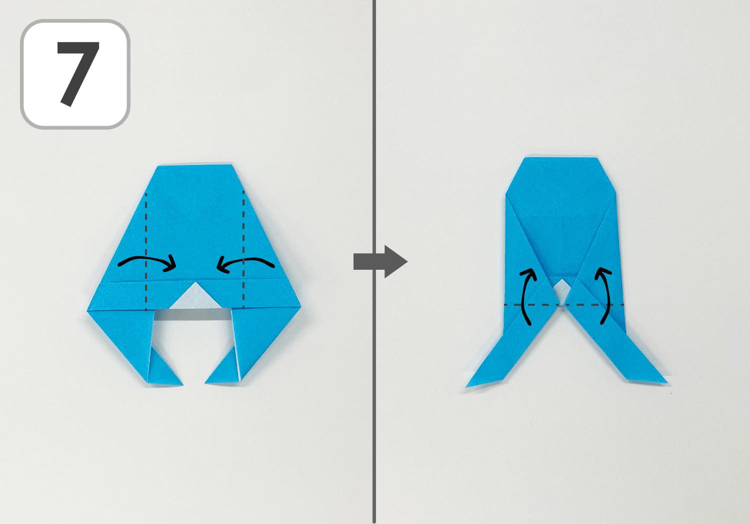 ⑦左:左右の角を点線で内側に折ります。