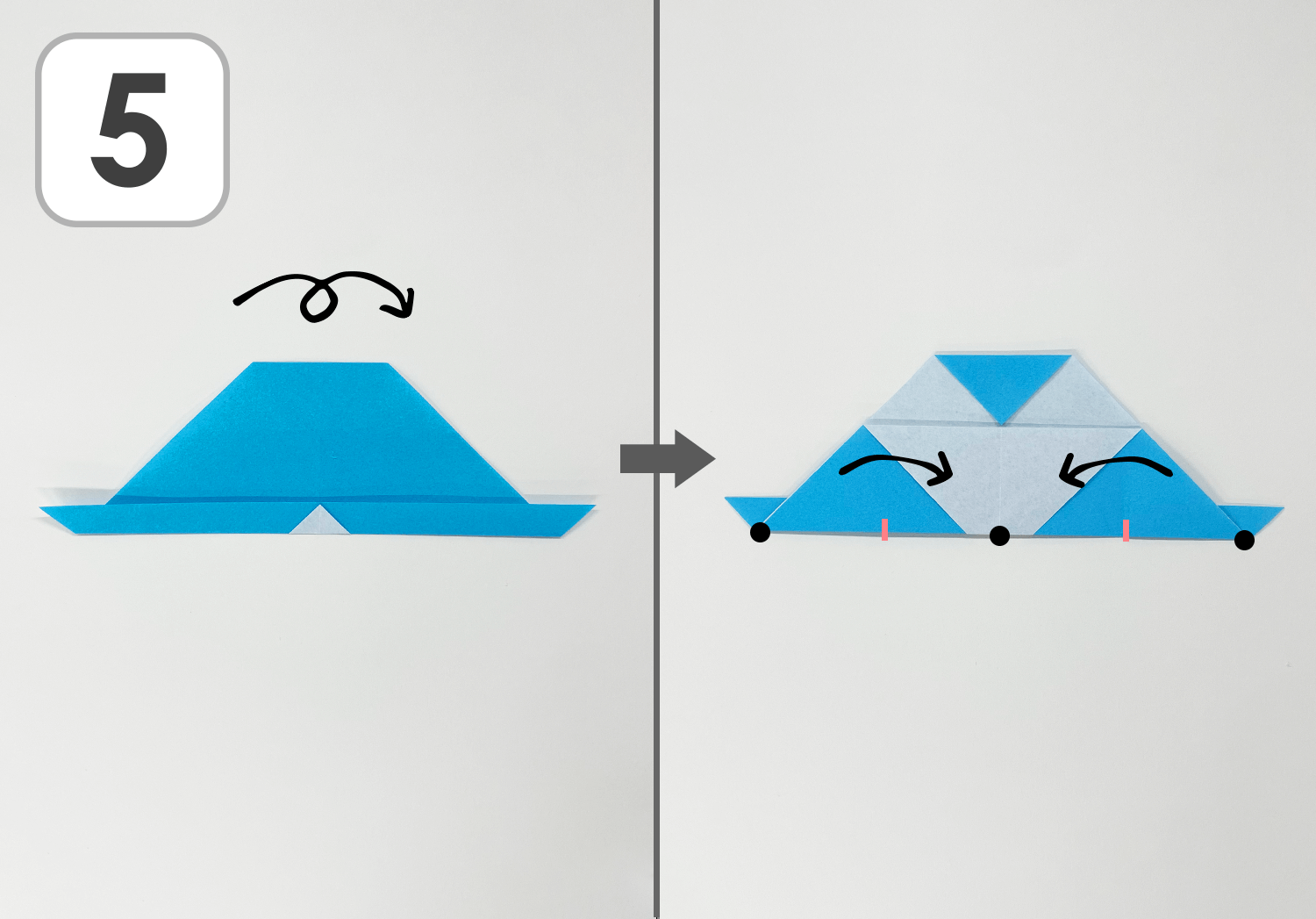 ③左:中央の点線で上向きに折ります。