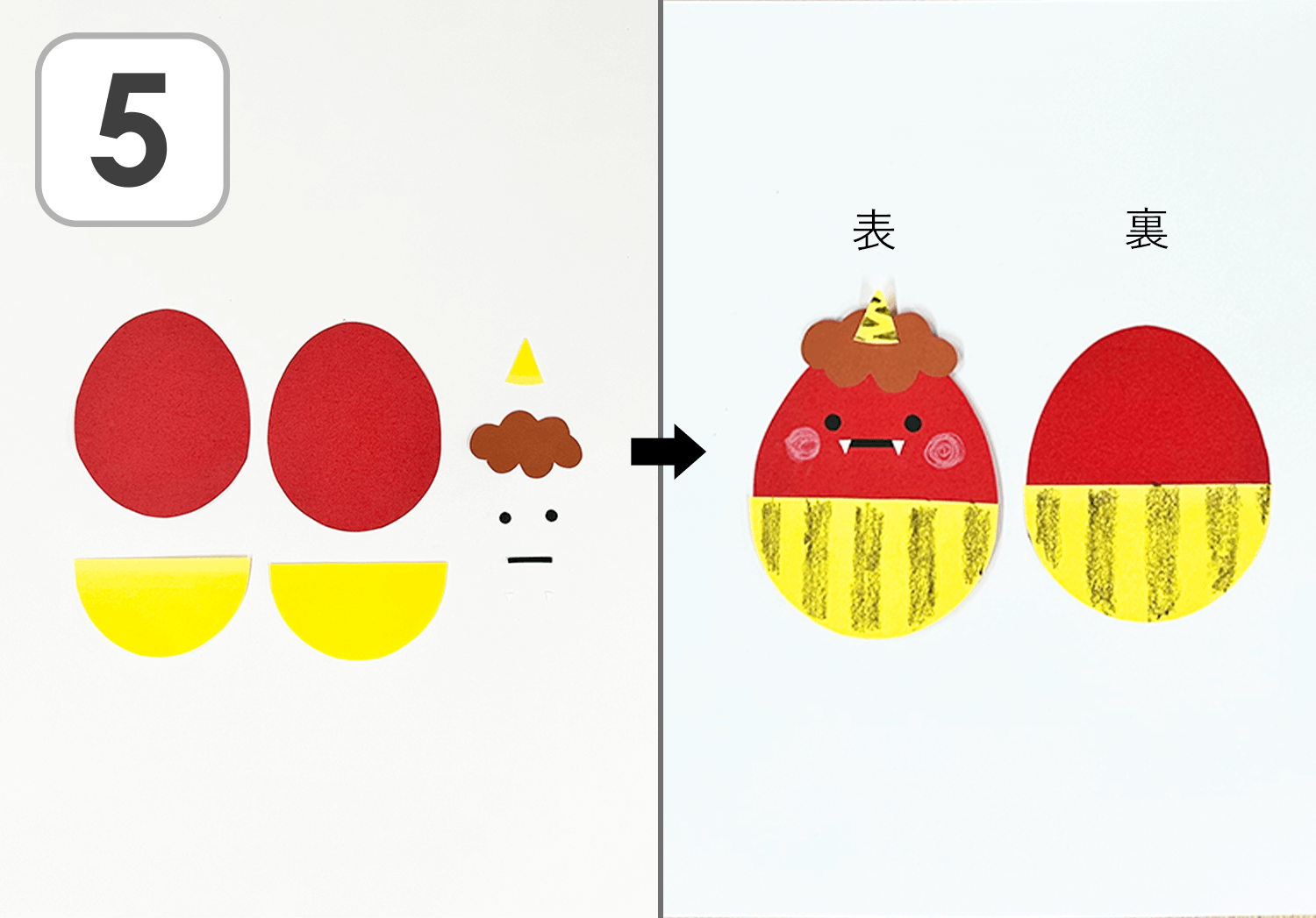 ⑤色画用紙で鬼のパーツを切り出し、表用・裏用それぞれに貼り合わせます。