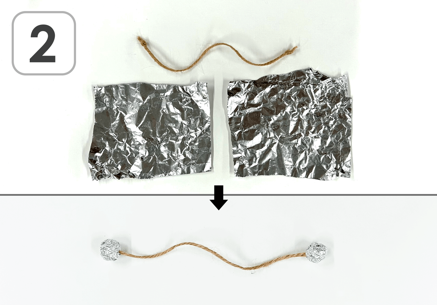 下の画像のように、ひもの端の結び目をくるむように、アルミホイルを巻きます。