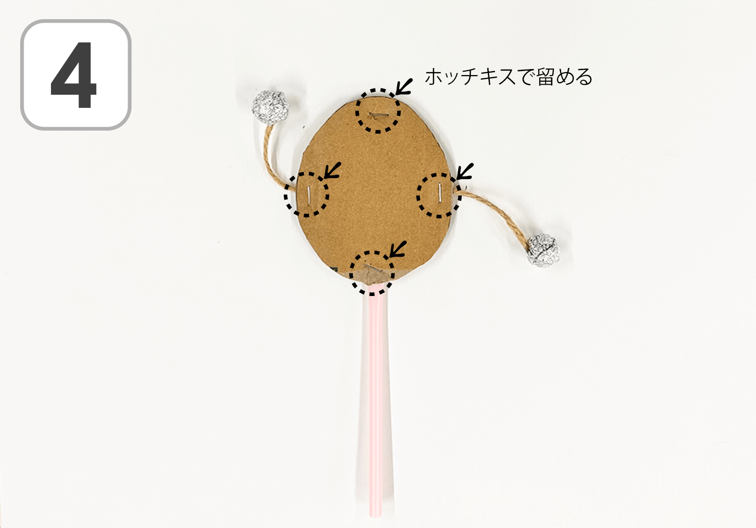 ④もう1枚の卵型の段ボールを上から被せ、画像の4か所をホッチキスで留めます。