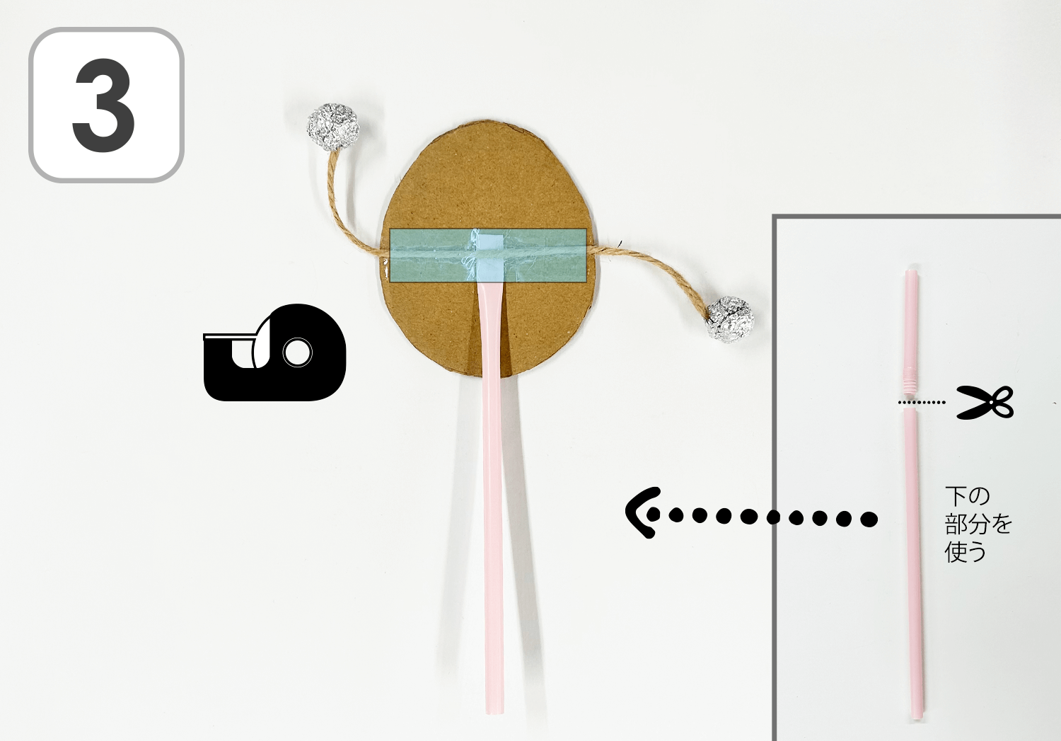 曲がる部分切ったストローと、2で作ったものをT字になるようダンボールの上に置き、画像のようにセロハンテープで貼り付けます。