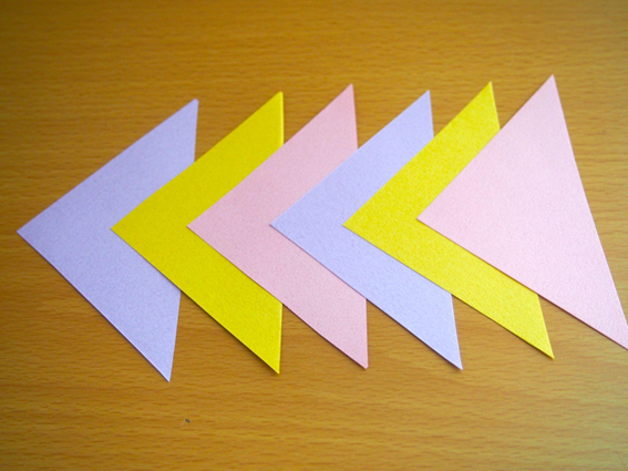 三角に切った折り紙をつなげて作る、三角つなぎの製作アイディアです。手先の器用さに合わせて、三角を小さくしても良いですね。そのほか、丸型や星型などでもアレンジ可能です。