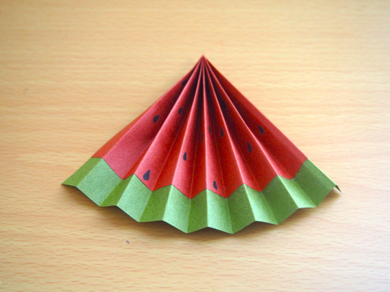 夏らしさを加えるため、笹にすいか飾りを加えても良いでしょう。赤色と緑色の折り紙を重ね、ジャバラ折りにするだけで完成です。夏製作、果物製作にもおすすめです。