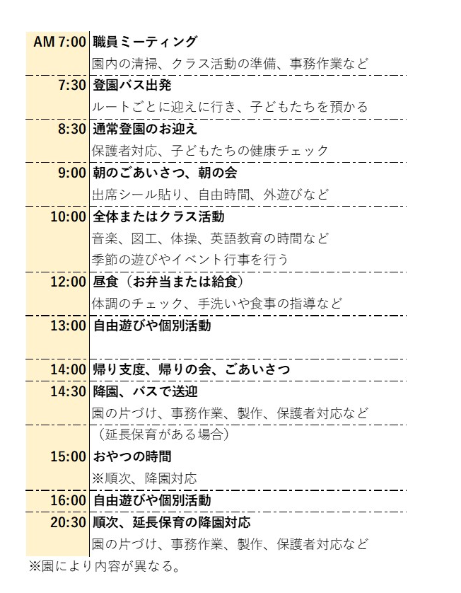 幼稚園教諭の主な1日のスケジュールを簡潔にまとめてみました。