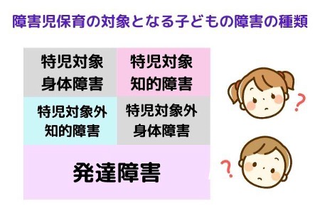 障害児保育の対象となる子どもの障害の種類は、特児対象身体障害・特児対象知的障害・特児対象外知的障害・特児対象外身体障害・発達障害で、そのほかに「気になるこども」が含まれるケースもあります。