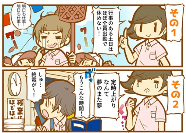 午睡の時間を利用してクラス会議をするところもあり、休憩する暇がないことも保育業界では珍しくありません。