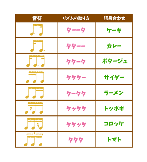 この表でリズムを覚えるまでは、語呂合わせを利用して少しずつ慣れていってくださいね♪