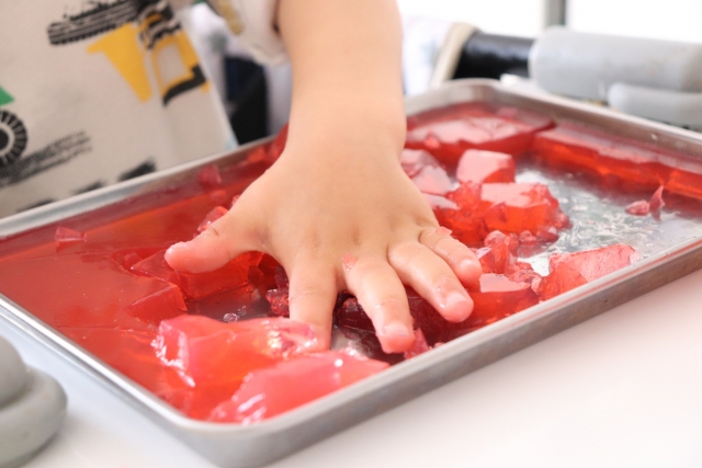 寒天遊びは、冷やした寒天により気持ちのいい感触を楽しめます。指でつついたり、手のひらで握ったりするだけでも楽しいので0~1歳児にもピッタリです。