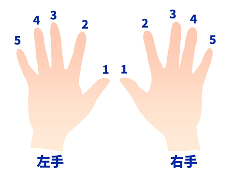 左右10本の指には、それぞれ決まった番号が存在します。上図のように、親指が①、人差し指が②、中指が③、薬指が④、小指が⑤となります。手の指は左右対称になっているので、内から外に向かって①~⑤と覚えましょう。