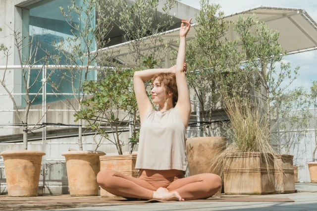 ③天井に向かって手を伸ばして手の甲を合わせ、体の横に手を下ろします。